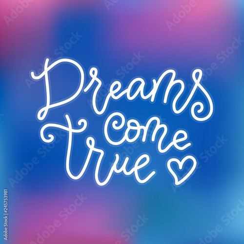 Modern calligraphy lettering of Dreams come true in white on pink blue background in mono line style for decoration, poster, banner, postcard, greeting card, gift tag, present, holiday