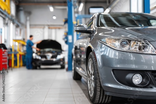 Modern car being serviced in a clean, well-lit automotive workshop auto service garage, showcasing maintenance, diagnostics, and mechanical repair environment.