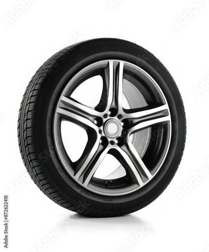 rubber tire, tire, wheel, modern, vehicle, automotive, rubber, tread, traction, transportation, isolated, white background, no people, automobile, rim, shine, metallic, spoke, maintenance, road safety, performance, hard-wearing, car wheel, car repair