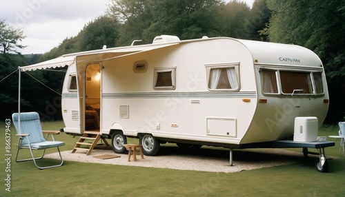 modern caravan parked at the cottage, lighted and with camping chair awning and furniture,