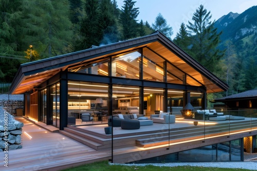 chalet, dusk, mountain, alps, dolomite, italy, architecture, luxury, home, house, real estate, window, evening, light, illumination, warm, patio, terrace, forest, wood, timber, modern, design, interior design, nature, landscape, travel, tour tourism, lifestyle, cosy, peaceful, serene, scenic, tranquil, illuminated