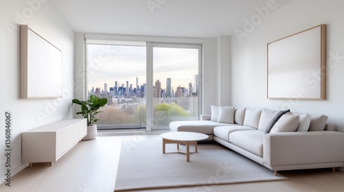 Modern city apartment living room. Spacious, bright, and minimalist living area with panoramic city views