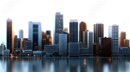 Modern city skyline at sunset with reflective water and vibrant lights in the background