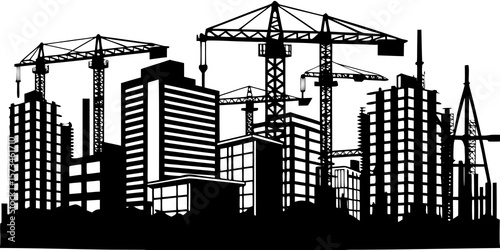 Modern city skyline with multiple construction cranes and high rise buildings silhouette isolated on white background