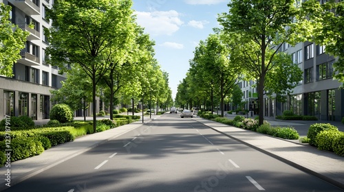 Modern City Street Lined with Lush Green Trees and Modern Buildings Sunny Day