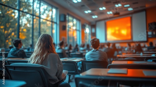 student, teaching, lecture, teacher, lighting, listening, classroom, layout, learning, presentation, seated, atmosphere, soft, school, screen, desk, room, window, prof, education, projector, ambient, chair, slide, people, waiting, ratio, brightness, light, space, modern, facet, equipment, natural, view