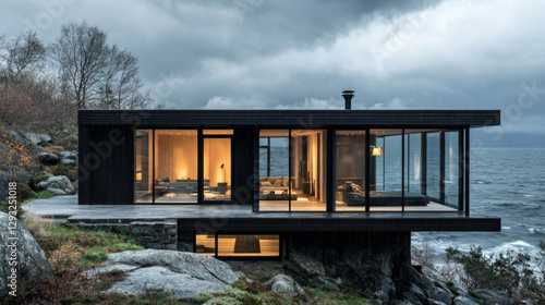 house, modern, architecture, cliff, ocean, storm, wave, dark, dramatic, cloud, moody, luxury, minimalist, glasses, window, nature, landscape, coastline, sea, weather, rain, stormy, rocky, elegant, contemporary, design, night, evening, warm, contrast, calmness, isolation, peaceful, retreat, scenic, view, dramatic sky, wilderness, remote, futuristic, sophisticated