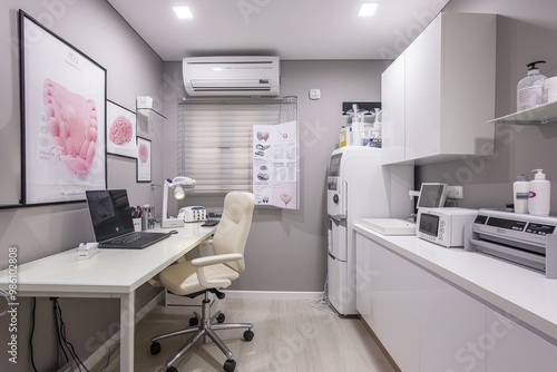 Modern Clinic Office with Breast Cancer Awareness Poster for Health Education and Medical Consultations