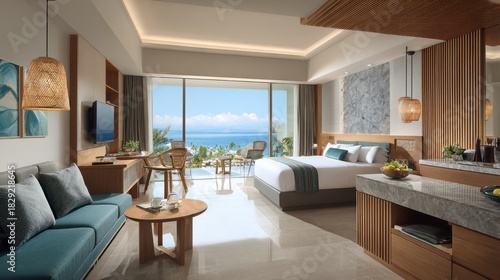 Modern Coastal Hotel Room with Ocean View, Natural Light, and Stylish Interior Design Featuring Relaxing Atmosphere and Comfortable Furniture