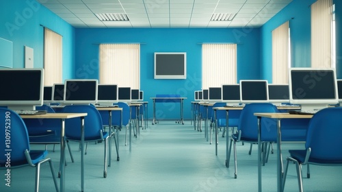 computer, laboratory, technology, education, classroom, workspace, desk, monitor, chair, blue, interior, design, learning, equipment, empty, digital, information technology, study, computer-screen, wall, window, school, training, innovation, space, setup, furniture, simplicity, layout, professional, minimalism, teaching, academic, bright, organised, research, software, electronic, collaborative, virtual, office