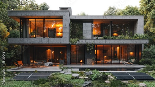 house, modern, architecture, home, building, contemporary, design, villa, residence, dwelling, concrete, glasses, window, luxury, elegant, stylish, forest, tree, nature, landscape, night, evening, light, illumination, interior, exterior, pool, swimming, solar, panel, energy, sustainable, green, eco, garden, plant, patio, terrace, waterfront, property, residential, style