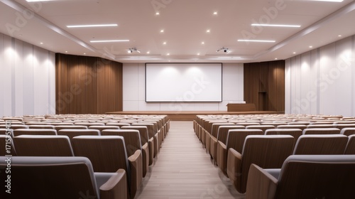 Modern conference hall with empty seats, projector screen, and warm lighting for presentations