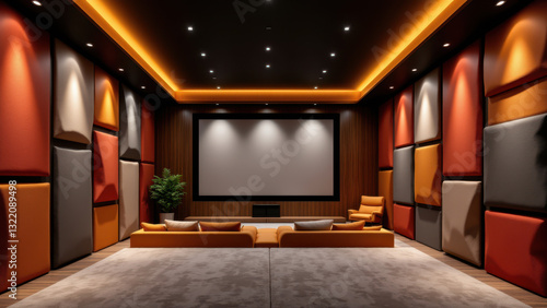 Modern conference room with orange accent walls, acoustic panels, and comfortable seating arrangement.