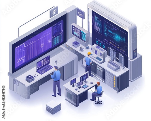 Modern Control Room with Digital Displays and Technicians Working