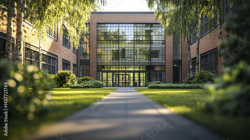 corporate, building, symmetric, window, design, modern, architecture, greenery, pathway, exterior, landscaping, brick, glasses, urban, office, structure, nature, sunlight, contemporary, environment, facades, entrance, tree, plant, space, symmetry, peaceful, inviting, professional