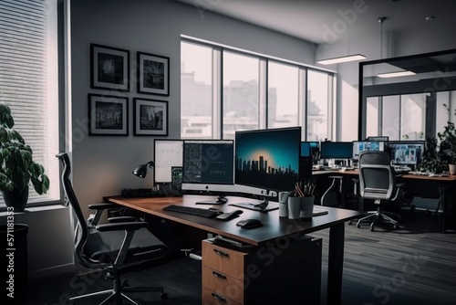 Modern corporate office interior with cubicles, filing cabinets and wall clock