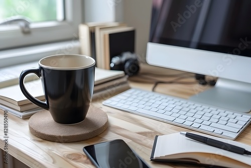 home, office, hot drink, technology, desk, computer, keyboard, mug, smartphone, notebook, pen, earphones, work, remote, modern, cosy, wood grain, window, natural light, productivity, comfort, minimalist, design, interior, lifestyle, freelance, equipment, essential, organisation, efficiency, workspace, ergonomic, accessory, style