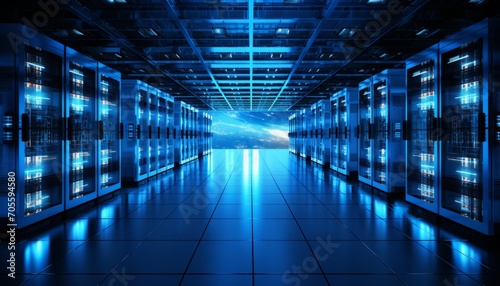 Modern data center with organized state of the art server racks emitting soft blue glow