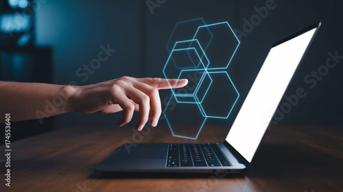 digital, interface, technology, innovation, modern, futuristic, concept, hexagon, hand, laptop, screen, computer, connection, networking, datum, communication, design, abstract, geometric, virtual, cyberspace, cloud, computing, cyberspace, online, business, professional, touch, finger, software, development, programming, coding, analysis, strategy, research, solution