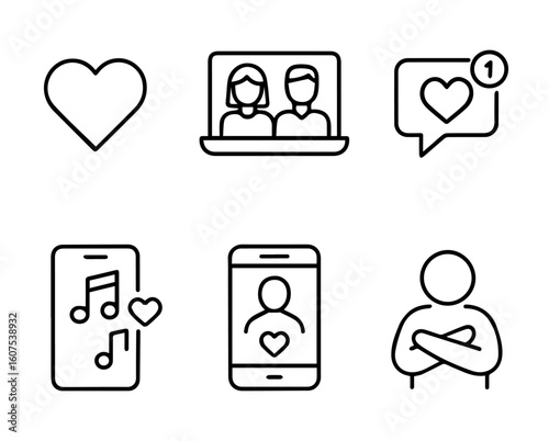 Modern Digital Love Icon Set, Minimal Black Vector Symbols Representing Online Romance, Communication, and Connection, Editable Formats: AI, EPS, JPG, PNG, Ideal for Both Digital and Print Use