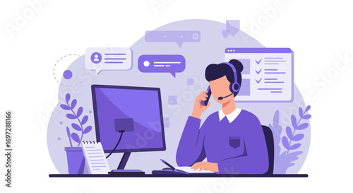 digital, workspace, illustration, computer, online, productivity, communication, desktop, technology, office, work, remote, abstract, purple, monitor, plant, notebook, pen, connection, network, desk, minimalist, graphic, business, study, learning, customer service, service, support, agent, helper