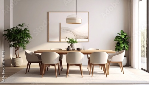room, dining, table, chair, wood, modern, minimalist, plant, potted, green, interior, home, house, decor, decoration, design, light, bright, clean, elegant, contemporary, furniture, domestic, indoor, living, space, wall, art, frame, picture, abstract, pendant, fixture, lamp, window, natural, aesthetic, comfortable, serene, peaceful, stylish, chic, neutral, beige, white, brown, simple, organised, roomy