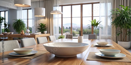 Modern dining room with an empty soup bowl, empty, soup bowl, modern, elegant, interior design, table setting, contemporary