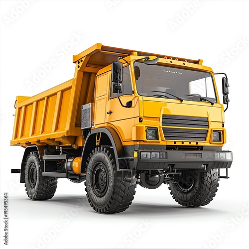 Modern dump truck, isolated on white, dynamic angle, precise detailing, sharp edges, clear and high resolution, construction vehicle