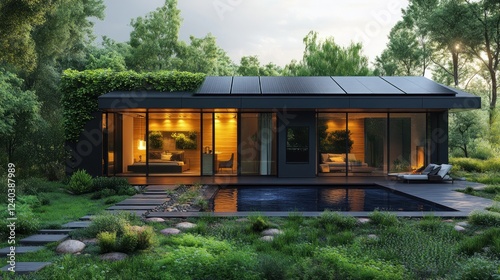 house, modern, eco, friendly, solar, panel, pool, architecture, design, home, contemporary, sustainable, energy, efficient, green, nature, landscape, tree, wood, forest, garden, grass, plant, vegetation, waterway, water, dark, black, wood, interior, exterior, lighting, window, glasses, minimalist, sleek, stylish, serene, tranquil, peaceful, relaxing, comfortable, luxury, elegant, roomy