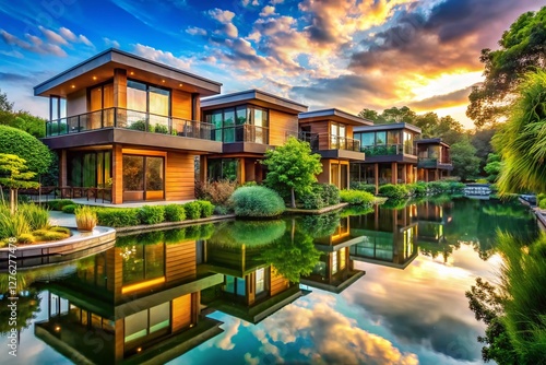 Modern Eco Homes, Lush Greenery, Tranquil Water Reflections: Sustainable Architecture Photography