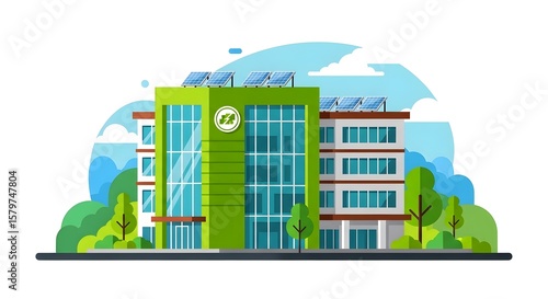 building, office, modern, green, solar, panel, environmentally friendly, sustainable, architecture, facades, glasses, tree, landscape, nature, city, urban, design, flat, illustration, cartoon, contemporary, business, company, exterior, environment, renewable, energy, technology, commercial, structure