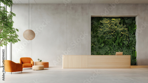 Modern eco-friendly office space green wall. Natural light illuminates interior room. Orange armchairs, wooden reception desk create cozy atmosphere. Plants, round pendant light enhance design. Space