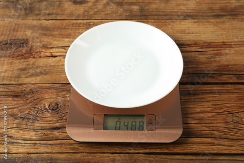 Modern electronic kitchen scale with plate on wooden table, closeup