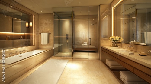 bathroom, interior, modern, luxury, design, decor, tile, glasses, lighting, relaxation, shower, tap, sink, clean, space, towel, mirror, surface, minimalism, flower, beige, ambience, home, elegant, comfort, functionality, architecture, contemporary, stylish, warm, soothing, polish, bright, roomy, spa, wellness, neat, fixture, chic, premium, serene, tranquil, hygiene, accessory, simple, aesthetic, facility