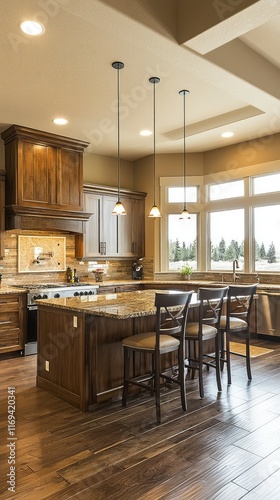 kitchen, elegant, modern, walnut, cabinet, interior, design, bright, window, island, counter, stool, lighting, flooring, warm, wood, atmosphere, home, residential, space, cosy, natural, stylish, comfortable, culinary, appliance, cooking, decor, architecture, contemporary, inviting, colours, texture, relaxing, family, meal, gathering, ambience, clean, roomy, luxury, sustainable, renovation