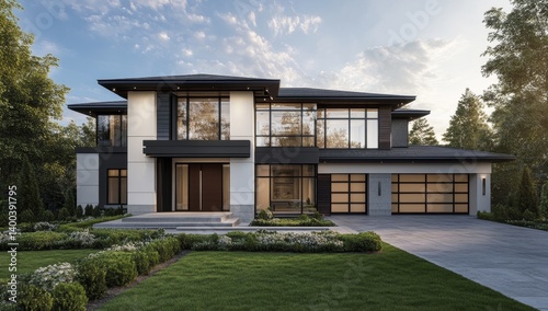 Modern, elegant, two-story home with contemporary design. Spacious, light-filled interiors, large windows, and sleek exterior. Landscaped yard with manicured lawns and gardens