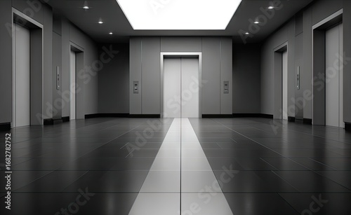 elevator, hall, modern, grey, dark, empty, interior, architecture, design, commercial, minimalist, contemporary, smooth, polished, tile, floor, door, light, ceiling, reflective, illumination, space, vertical, horizontal, symmetry, neutral, tech, industrial, future, clean, calm, elegant, sophisticated, functional, business, corporate, professional, modernism, rendering, three-dimensional, steel, technology, building, public, urban, evacuated