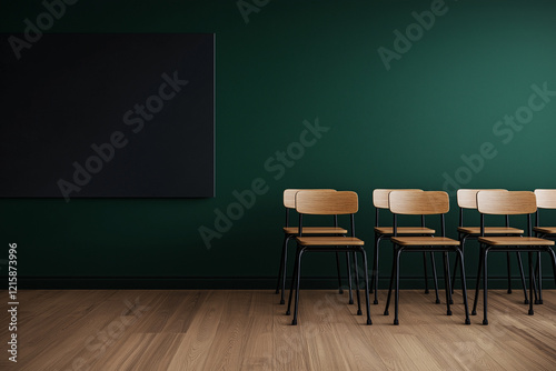 Modern empty classroom with blackboard and wooden desks, featuring dark green wall and wooden flooring, creating calm and focused learning environment