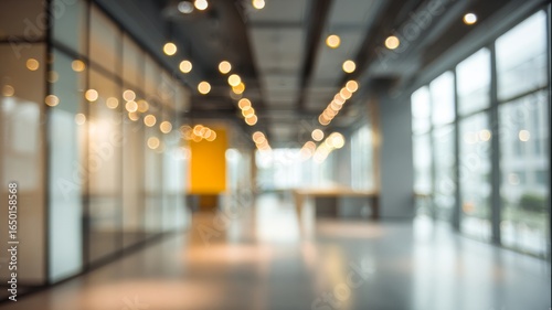 Modern empty office interior with bright bokeh lights, blurred open workspace, corporate business environment background, contemporary office design for presentations and marketing visuals