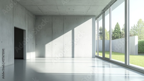 Modern empty office space with large windows and open door, featuring sleek walls, contemporary design, and natural light