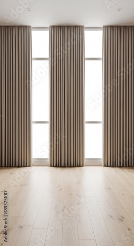 Modern empty room with large windows and beige curtains