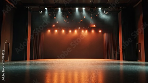 Modern empty stage with spotlight illumination and dark background, ready for performance, showcasing professional lighting design and spacious floor area for artists.