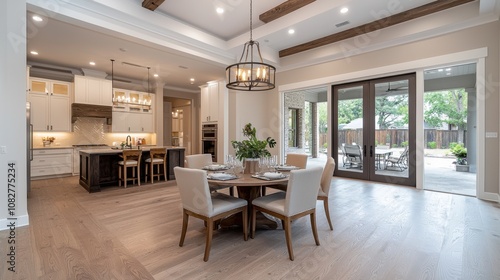 farmhouse, dining, kitchen, modern, interior, home, design, decor, room, table, chair, window, patio, backyard, open, concept, white, cabinet, island, wood, floor, light, chandelier, plant, contemporary, style, elegant, luxury, living, space, house, architecture, new, construction, renovation, real estate, property, lifestyle, comfortable, family, gathering, entertaining, breakfast, lunch, dinner, meal, food, drink, relax