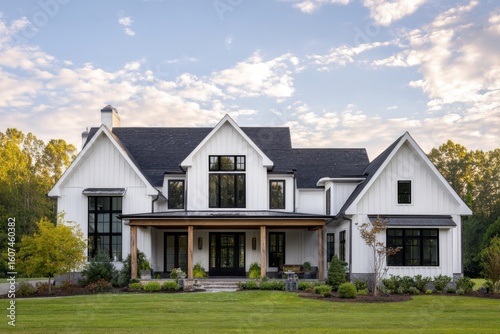modern, farmhouse, exterior, design, large, window, welcoming, porch, lush, landscaping, afternoon, sky, residential, architecture, suburban, home, greenery, space, stylish, facades, bright, atmosphere, natural, surrounding, architectural, feature, peaceful, setting, contemporary, style, white, black, roof, roomy, yard, nature, inviting, entrance, front, view, elegant, sunlight, new, construction, serene, environment, beautiful, family