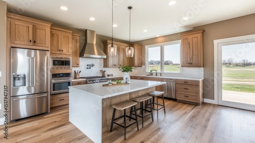 Modern Farmhouse Kitchen Design: Oak Cabinets, Stainless Steel Appliances, and Island