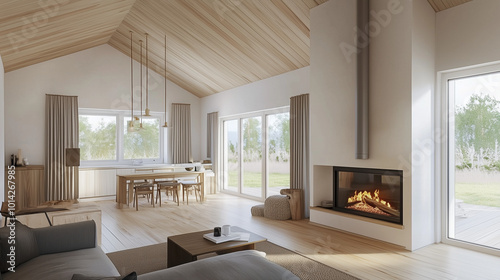 living room, farmhouse, modern, interior design, home decor, architecture, house, contemporary, roomy, cosy, comfortable, fireplace, wood, natural light, window, sunlight, family room, furniture, sofa, coffee table, dining table, chair, minimalist, stylish, elegant, warm, inviting, serene, peaceful, relaxation, luxury, comfort, style, design, home, interior, room, hearth, fire