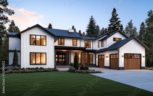 farmhouse, modern, house, home, property, architecture, exterior, design, luxury, twilight, evening, forest, tree, driveway, landscape, residential, building, contemporary, elegant, roomy, suburban, countryside, nature, roof, window, wall, yard, grass, night, dusk, sky, cloud, sale, large, comfortable, beautiful