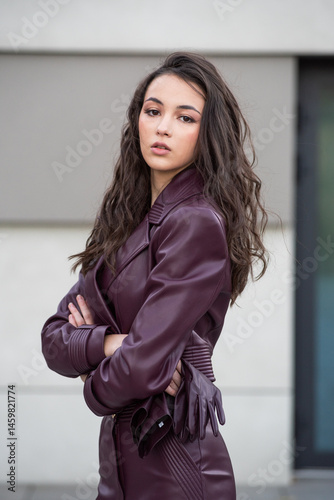 leather, burgundy, skirt, jacket, woman, fashion, style, fabric, texture, elegant, chic, trend, urban, clothing, outfit, modern, posh, minimal, female, look, material, walk, model, pose, portrait, youth, design, cut, outdoors, photograph, grace, slim, coiffure, glove, heel, beauty, autumn, trendy, street, minimalism, premium, luxury, winter, garment, fitted