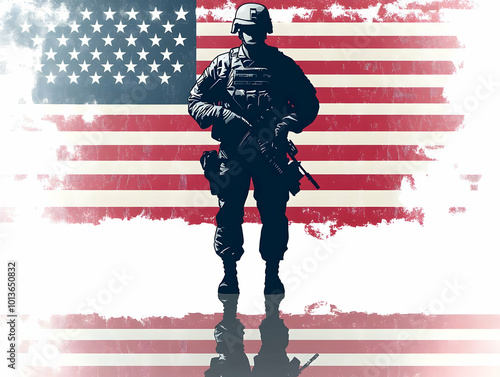Modern Flat Glossy Silhouette of Soldier Against Reflective American Flag - Perfect Design for Veterans Day Celebrating Service and Dedication in Vector Style