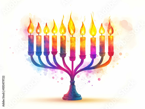 menorah, glowing, abstract, digital artwork, candle, festive, futuristic, e-business, tablet, gelt, holographic, copy space, white background, isolated, holiday